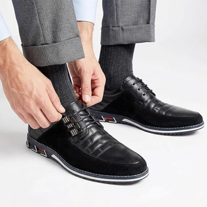 Stylowe męskie buty Oxford w kolorze czarnym to połączenie klasycznego designu, komfortu i trwałości. Wykonane z wysokiej jakości skóry naturalnej, oferują doskonałą oddychalność, elastyczność oraz wodoodporność, zapewniając wygodę i ochronę stóp przez cały dzień.